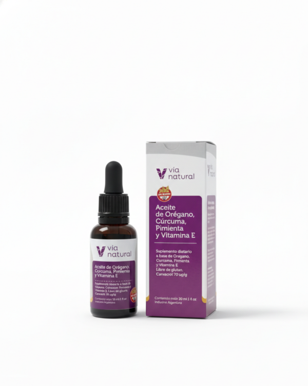 Aceite de orégano con cúrcuma en gotas, ideal para reforzar defensas, cuidar la digestión y apoyar el bienestar general.